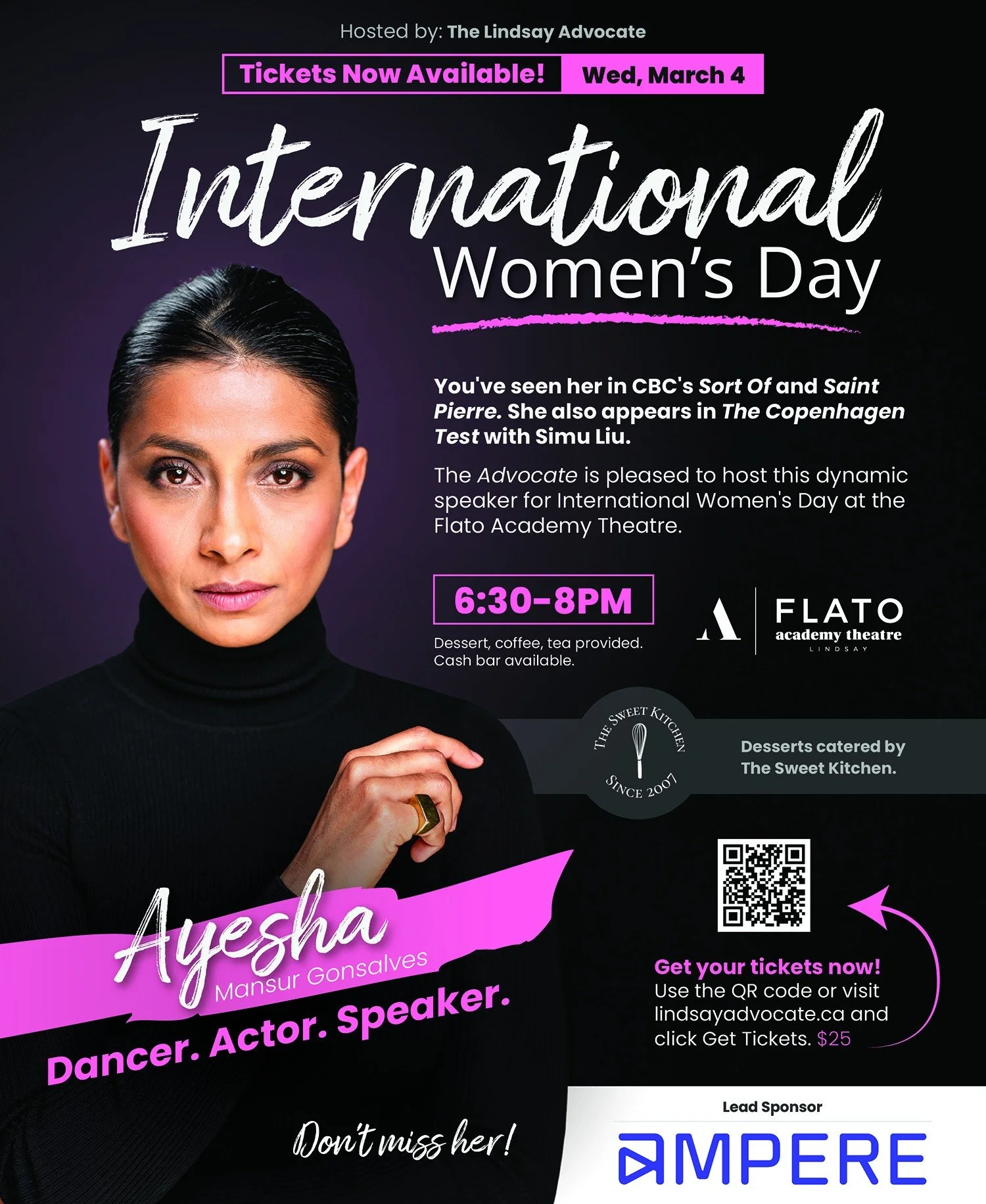 We’re honoured to host Ayesha Mansur Gonsalves for a special International Women’s Day event at the FLATO Academy Theatre Lindsay.